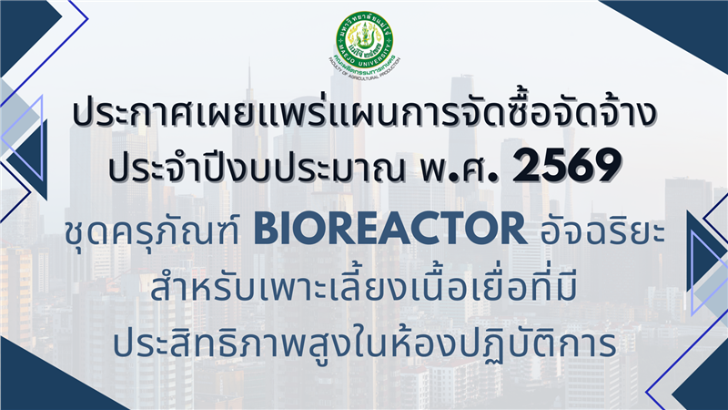 ประกาศเผยแพร่แผนการจัดซื้อจัดจ้าง ประจำปีงบประมาณ พ.ศ. 2569 ชุดครุภัณฑ์ Bioreactor อัจฉริยะ สำหรับเพาะเลี้ยงเนื้อเยื่อที่มีประสิทธิภาพสูงในห้องปฏิบัติการ
